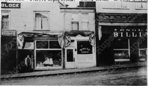 Title: Alder Block, the Grotto Cigar Store, White Lunch and English Billiards on 3rd Avenue West in Prince Rupert, B.C. in 1921