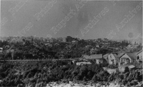 Scope & Content: Item consists of a view of Alfred Street with a panoramic view of Prince Rupert in the background. The view includes houses, King Edward School and Booth Memorial School. Handwritten annotation on recto reads: "King Edward School. Booth School. Alfred St. 1924." Stamped annotation on verso reads: "Photo by Jack Wrathall Prince Rupert, B. C."
