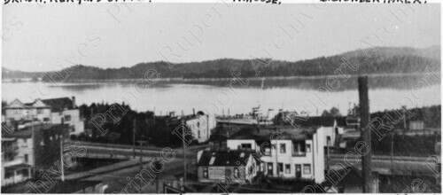 Scope & Content: Item consists of a view of 2nd Avenue and 2nd Street including Dr. W. T. Kergin's Office, CN House, the B.C. Undertaker's office, the Bayview Apartments and Hays Block. A steamship can be seen in the harbour in the background. Handwritten annotation on recto reads: "Dr. W.T. Kergin's Office. C.N. House. B.C. Undertaker. 1920. Bayview Apt. Hays Blk." Stamped annotation on verso reads: "Photo by Jack Wrathall Prince Rupert, B. C."