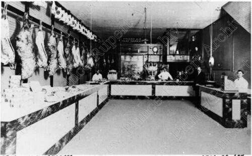 Scope & Content: Item consists of a view of the interior of Frizzell's Meat Market. Five men and a woman can be seen standing in the store. Butchered can be seen on the left. Handwritten annotation on recto reads: "Frizzell's Meat Market." Stamped annotation on verso reads: "Photo by Jack Wrathall Prince Rupert, B. C."