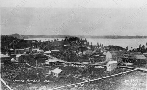 Scope & Content: Item consists of an overhead view of 3rd Avenue, 5th Street, 6th Street and 7th Street. The view includes houses, tent houses, wooden walkways and a building under construction. Handwritten annotation on recto reads Prince Rupert, BC. 6th Street. 3rd Ave. 5th St. Allen Photo Aug 6/09. 600-700 Blks. 3rd. Ave. Aug. 6 - 1909." Stamped annotation on verso reads: "Photo by Jack Wrathall Prince Rupert, B. C."