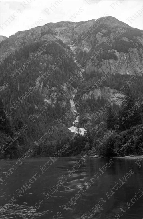 Scope & Content: Item consists of a view of the Khyex River including a view of the mountains from the water. Handwritten annotation on recto of copy 2 reads: "Khyax [sic] River. East of Tyee. 1946." Stamped annotation on verso of copy 2 reads: "Photo by Jack Wrathall Prince Rupert, B. C."