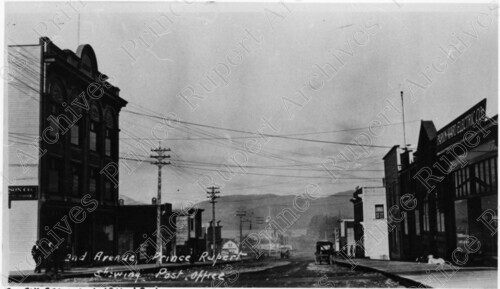 Scope & Content: Item consists of a view of the 300 Block of 3rd Avenue West. The Parkin-Ward Electric Co. can be seen on the right. The post office can also be seen. Handwritten annotation on recto reads: "2nd Avenue, Prince Rupert showing Post Office. 300 Blk. 3rd Ave. W. 1910. J.R.W."