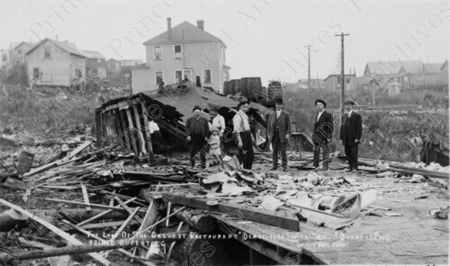 Scope & Content: Item consists of a view of a group of six men, a woman, a young girl and a dog standing in the debris of the demolished Calumet Restaurant. The man pictured fourth from the left is George Tite. Houses and other buildings can be seen in the background. Handwritten annotation on recto reads: "The Last of the "Calumet Restaurant" Prince Rupert B.C. Demolished Sept 13th 1910. J. Bonneau Prop. (McRae Bros Photo) 4th Man from Left. Geo. Tite." Stamped annotation on verso reads: "Photo by Jack Wrathall Prince Rupert, B. C."