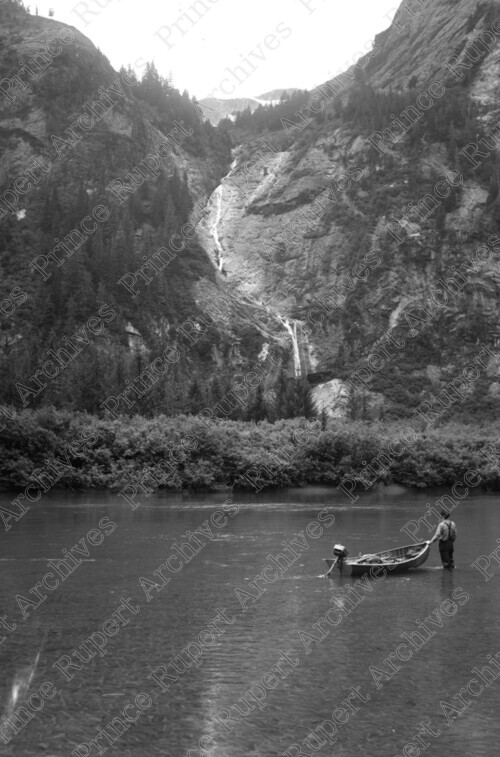 Scope & Content: Item consists of Ron Roberts standing in the Kasiks River wearing hip waders with his hand on a motorboat while looking up at a waterfall. Handwritten annotation on recto of copy 2 reads: "Kasicks [sic] River. East of Kwinitsa. Skeena River. 1947. J.R.W. - Ron Roberts." Stamped annotation on verso of copy 2 reads: "Photo by Jack Wrathall Prince Rupert, B. C."