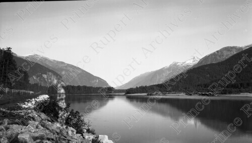 Scope & Content: Item consists of a view of the Skeena River. Mountains can be seen in the background. Handwritten annotation on recto of copy 2 reads: "Skeena River. Near Kwinitsa. 1949." Stamped annotation on verso of copy 2 reads: "Photo by Jack Wrathall Prince Rupert, B. C."