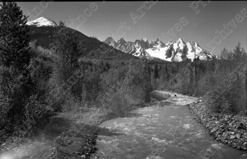 Scope & Content: Item consists of Coyote Creek with the Seven Sisters Peaks in the background. Handwritten annotation on recto of copy 2 reads: "Coyote. Cr. 7 Sisters Mts. on Skeena. R. Between Terrace & Hazelton. 1948." Stamped annotation on verso of copies 2 and 3 reads: "Photo by Jack Wrathall Prince Rupert, B. C."