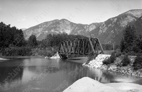 Scope & Content: Item consists of a CN Railway bridge across the Skeena River. The view includes hydro poles and mountains. Handwritten annotation on recto of copy 2 reads: "Skeena River. 1945." Stamped annotation on verso of copy 2 reads: "Photo by Jack Wrathall Prince Rupert, B. C."