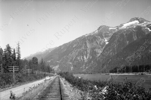 Scope & Content: Item consists of a car parked on the road alongside the Skeena River. CN Railway tracks can be seen to the right of the road and power lines can be seen to the roads left. A mountain range can be seen in the background.