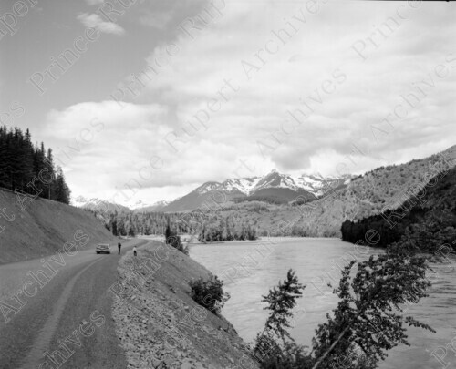 Scope & Content: Item consists of a view of the Skeena River East of Terrace. Two people can be seen on the side of a dirt road near a car. Mountains can be seen in the background. Handwritten annotation on recto of copies 2 and 3 reads: "Skeena River. East of Terrace. 1960." Stamped annotation on verso of copies 2 and 3 reads: "Photo by Jack Wrathall Prince Rupert, B. C."