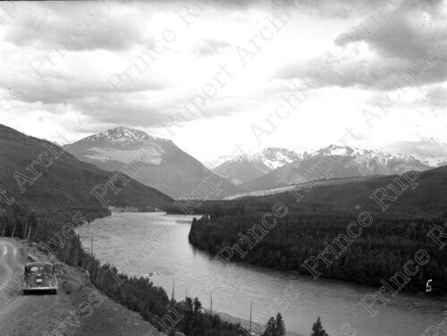 Scope & Content: Item consists of a car parked on the side of a dirt road along the Skeena River West of Hazelton. Mountains can be seen in the background. Handwritten annotation on recto of copy 2 reads: "Skeena River. West of Hazelton. 1945." Stamped annotation on verso of copy 2 reads: "Photo by Jack Wrathall Prince Rupert, B. C."