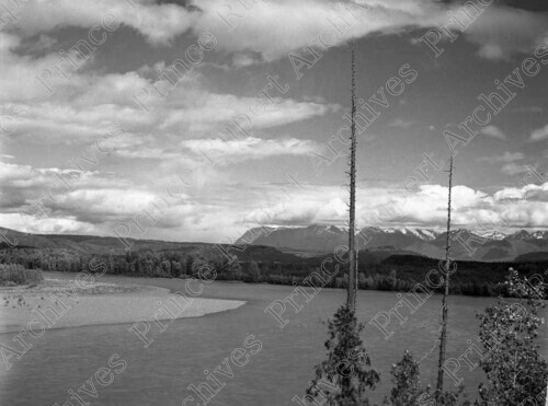 Scope & Content: Item consists of a view of the Skeena River West of Hazelton. The view includes mountains and sandbars.