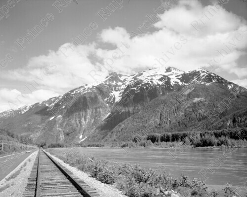 Scope & Content: Item consists of a view of the Skeena River, Highway 16 and mountains. Handwritten annotation on recto of copies 2 and 3 reads: "Skeena River. West of Kwinitsa. 1955." Stamped annotation on verso of copies 2 and 3 reads: "Photo by Jack Wrathall Prince Rupert, B.C."