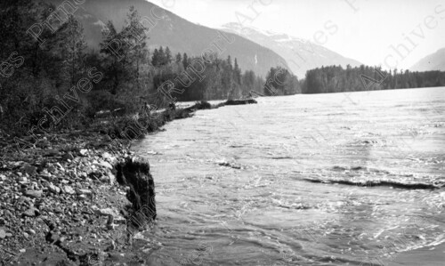 Scope & Content: Item consists of a washed out CN rail bridge and downed power lines during the Skeena River Flood. Mountains can be seen in the background. Handwritten annotation on recto of copy 2 reads: "Washed Out Rail Bridge East of Kwinitsa - Big Flood. 1936." Stamped annotation on verso of copy 2 reads: "Photo by Jack Wrathall Prince Rupert, B. C."