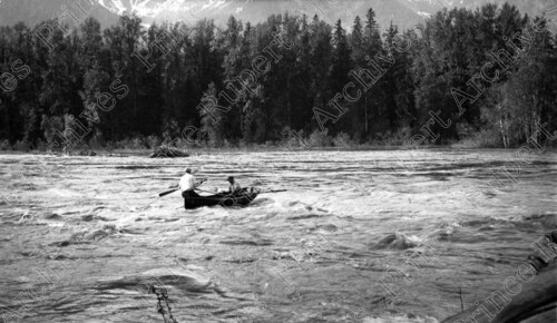 Scope & Content: Item consists of two men in a boat on the Skeena River during the Skeena River Flood. Handwritten annotation on recto of copy 2 reads: "Big Flood - 1936. Skeena River. C.N. Rail."