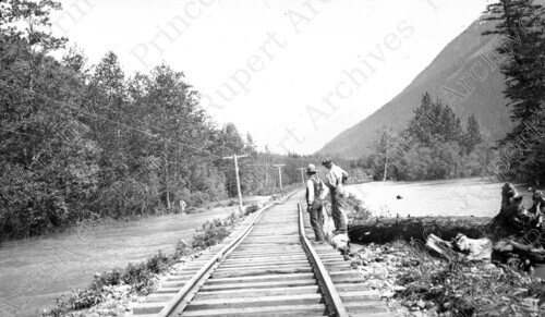 Scope & Content: Item consists of two men standing on CN Rail tracks after water begins to recede during the Skeena River Flood. Handwritten annotation on recto of copy 2 reads: "Flood Receding 1936. Skeena River." Stamped annotation on verso of copy 2 reads: "Photo by Jack Wrathall Prince Rupert, B. C."