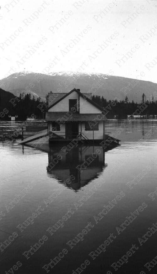 Scope & Content: Item consists of the Usk Hotel submerged in water during Skeena River Flood. A mountain range can be seen in the background. Handwritten annotation on recto of copy 2 reads: "Flood Picture of 1936 - Skeena River." Stamped annotation on verso of copy 2 reads: "Photo by Jack Wrathall Prince Rupert, B. C."