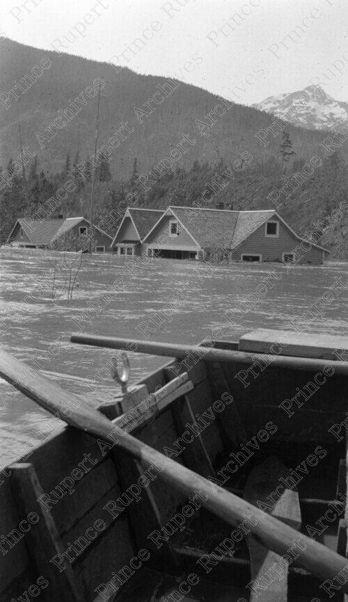 Scope & Content: Item consists of homes half submerged in water during the Skeena River Flood. Part of a boat can be seen in the foreground. Handwritten annotation on recto of copy 2 reads: "Big Flood of 1936 - Skeena River." Stamped annotation on verso of copy 2 reads: "Photo by Jack Wrathall Prince Rupert, B. C."