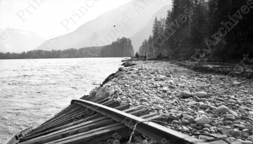 Scope & Content: Item consists of two men walking along the bank of the Skeena River after the flood near damaged CN railway tracks. Handwritten annotation on recto of copy 2 reads: "Looking West From East of Kwinitsa. Water Receding. 1936." Stamped annotation on verso of copy 2 reads: "Photo by Jack Wrathall Prince Rupert, B. C."