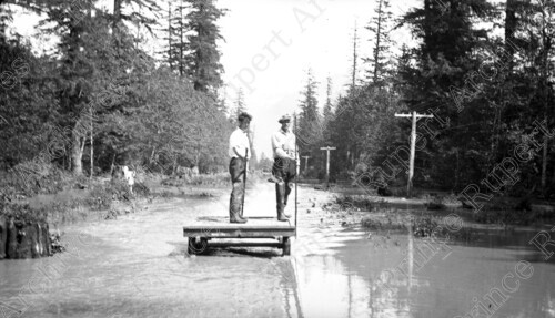 Scope & Content: Item consists of two men on a platform during the Skeena River Flood near submerged CN railway tracks. Partially submerged hydro poles can be seen on the right. Handwritten annotation on recto of copy 2 reads: "Big Flood - Skeena River 1936." Stamped annotation on verso of copy 2 reads: "Photo by Jack Wrathall Prince Rupert, B. C."