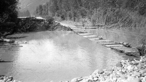 Scope & Content: Item consists of overturned CN railway tracks and downed hydro poles after the Skeena River Flood. Handwritten annotation on recto of copy 2 reads: "Big Flood - 1936 - Track Up Side Down. Skeena River." Stamped annotation on verso of copy 2 reads: "Photo by Jack Wrathall Prince Rupert, B. C."