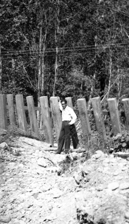 Scope & Content: Item consists of a man standing near CN railway tracks and ties turned upright like a fence during the Skeena River Flood. Handwritten annotation on recto of copy 2 reads: "After Flood. Showing Tracks & Ties. 1936" Stamped annotation on verso of copy 2 reads: "Photo by Jack Wrathall Prince Rupert, B. C."