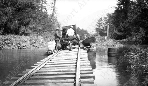 Scope & Content: Item consists of two men standing on railway tracks with a repair cart. An oil drum can be seen in the water and motorboat can be seen nearby.