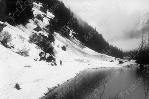 Scope & Content: Item consists of two men standing in snow after a snowslide near Kwinitsa Tunnel. The Skeena River can be seen on the right.