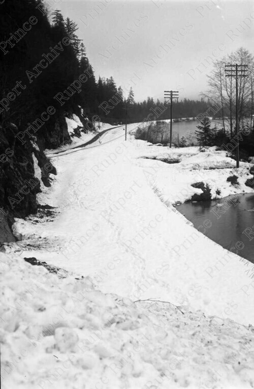 Scope & Content: Item consists of a view of a snowslide near Kwinitsa Tunnel including CN Railway tracks, hydro poles and the Skeena River.