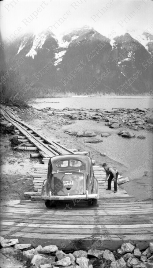Scope & Content: Item consists of a man on a wooden bridge while a car attempts to move past the snowslide at Kwinitsa Tunnel on the Skeena River. Handwritten annotation on recto of copy 2 reads: "West of Kwinitsa at Big Tunnel. Getting Around Big Slide." Handwritten annotation on verso of copy 2 reads; "Jack Wrathalls [sic] Car. Photo by Jack Wrathall Prince Rupert, B. C."