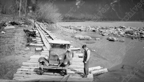 Scope & Content: Item consists of George Attrill standing on wooden roadway while George Thompson from Shames Mill tries to drive a car. Thompson is trying to drive around the snowslide at Kwinitsa Tunnel. The Skeena River can be seen on the right and hydro poles can be seen on the left. Handwritten annotation on recto of copy 2 reads: "Getting Cars Around Big Slide. Skeena River. 1945. George Attrill Standing & Geo. Thompson From Shames Mill. Kwinitsa Tunnel." Stamped annotation on verso of copy 2 reads: "Photo by Jack Wrathall Prince Rupert, B. C."