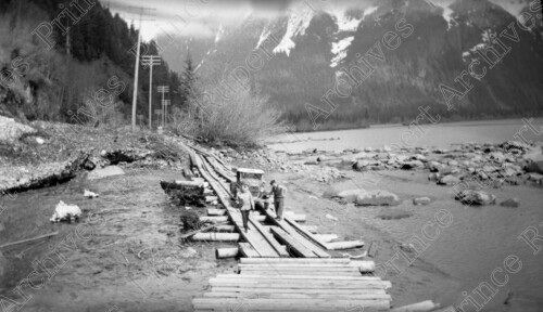Scope & Content: Item consists of a car being driven on a wooden roadway in order to get around the snowslide near Kwinitsa Tunnel. The Skeena River can be seen on the right.