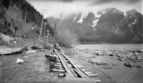 Scope & Content: Item consists of men standing beside a car on a wooden road and helping it get around the snowslide near Kwinitsa Tunnel. The Skeena River and a mountain range can be seen on the right.