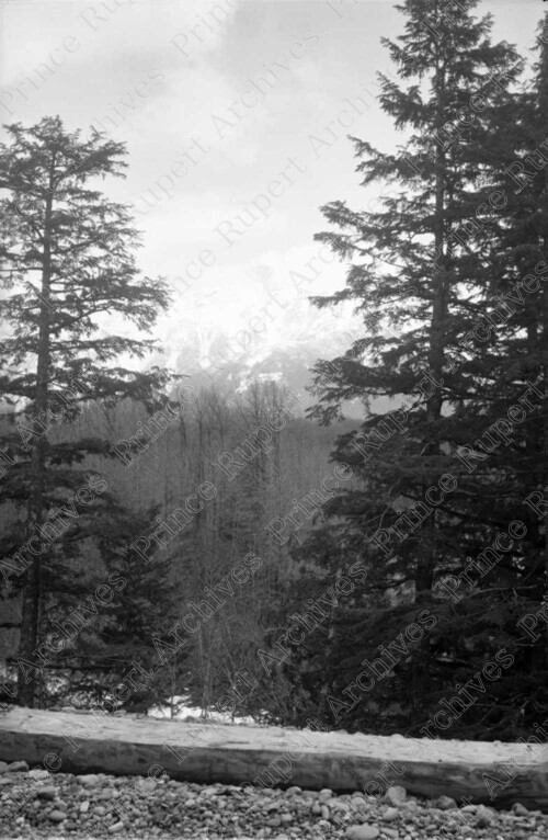 Scope & Content: Item consists of trees, snow and mountains near the Skeena River. The photo was taken after a snowslide at Kwinitsa Tunnel.