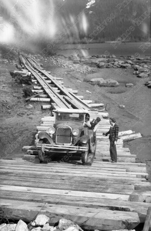Scope & Content: Item consists of two people guiding a man driving a car on a wooden roadway in order to get around a snowslide on near Kwinitsa Tunnel. The Skeena River can be seen on the right.