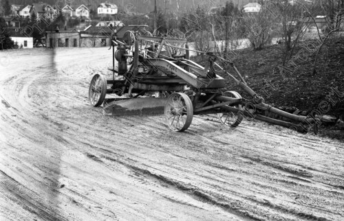 Scope & Content: Item consists of J-306E road grader on a dirt road in Prince Rupert. Houses can be seen in the background.