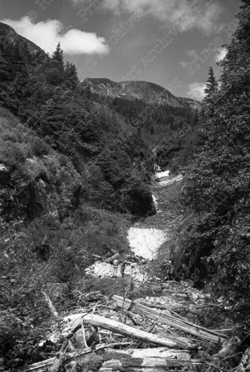 Scope & Content: Item consists of view of a mountain West of Terrace. Handwritten annotation on recto of copy 2 reads: "View Along Skeena River West of Terrace. 1946." Stamped annotation on verso of copy 2 reads: "Photo by Jack Wrathall Prince Rupert, B. C."