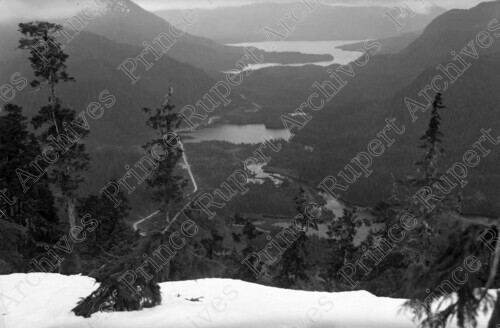 Scope & Content: Item consists of a view of Prudhomme Lake, Taylor Lake and Kloiya Bay from a mountain above the campground. Handwritten annotation on recto of copy 2 reads: "Prudhomme Lake. Taylor Lake. Cloya [sic] Bay. 1946." Stamped annotation on verso of copy 2 reads: "Photo by Jack Wrathall Prince Rupert, B. C."