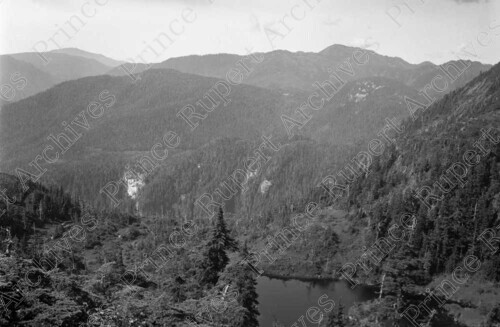 Scope & Content: Item consists of a view of mountains and Prudhomme Lake from a mountain.