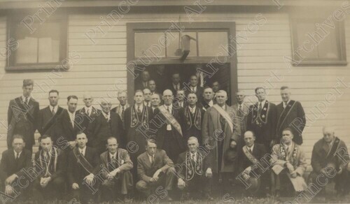 Scope & Content: item consists of a group of 32 men from the Oddfellows gathered in front of a buildings. Pictured in the middle row fourth from the left is David Owens Sr., ninth from the left is Jock Davidson and fourteenth from the left is Harry Dagget. Pictured in the front row second from the left is Joe DeLorme. Stamped annotation on verso reads: "Photo by Jack Wrathall Prince Rupert, B. C."