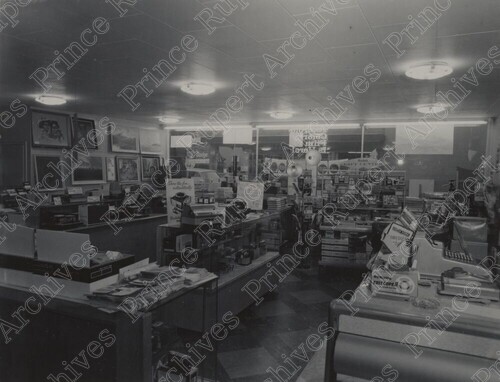 Scope & Content: Item consists of a view of the interior of Wrathall's Photo Finishing at 209 3rd Avenue West. Handwritten annotation on recto reads: "Wrathall's Photo Finishing. 1956. 209 - 3rd. Ave. W." Stamped annotation on verso reads: "Photo by Jack Wrathall Prince Rupert, B. C."