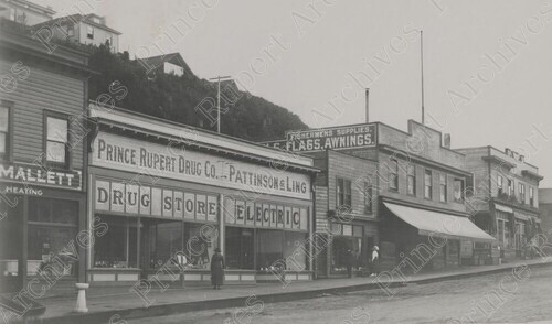 Scope & Content: Item consists of a view of the 200 and 300 block of 3rd Avenue West including the Prince Rupert Drug Co. and Pattinson & Ling Electric. Typed annotation on recto reads: "3rd. Ave. W. 1910 Opposite 2nd. St." Stamped annotation on verso reads: "Photo by Jack Wrathall Prince Rupert, B. C. Not to be reproduced or published without authority of Wrathall's Photo Finishing Prince Rupert, B. C. 1912."