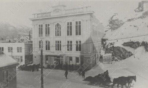 Scope & Content: Item consists of a view of city hall on Fulton Street. People and horse-drawn sleighs can be seen in front of the hall. Handwritten annotation on recto of copy 1 reads: "Fulton St. City Hall. 1914." Handwritten annotation on verso of copy 2 reads: "City Hall. Winter. Showing Horses & Sleighs 1920." Stamped annotation on verso of copies 1 and 2 reads: "Photo by Jack Wrathall Prince Rupert, B. C."