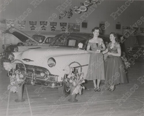 Scope & Content: Item consists of Maresa Windle and another woman wearing dresses and standing next to a car at the Kaien Motors and Frizzell Motor Products Ltd. car show. Handwritten annotation on recto reads: "1953. Kaien Motors." Stamped annotation on verso reads: "Photo by Jack Wrathall Prince Rupert, B.C. D.F. 1953."