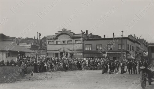 Scope & Content: Item consists of a view of 6th Street and 2nd Avenue West at Prince Rupert, B.C. An Indigenous marching band can be seen standing on the road on the right. The Westholme Opera House can be seen in the background. Handwritten annotation on recto reads: "6th. St. & 2nd. Ave. 1920." Stamped annotation on verso reads: "Photo by Jack Wrathall Prince Rupert, B. C."