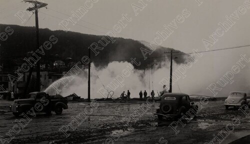 Scope & Content: Item consists of a view of the remains of the Central Hotel on 1st Avenue West and 7th Street after a fire. A fire fighter, who is obscured by a truck, is spraying the Hotel remains with water. A group of people can be seen standing in front of the Hotel remains. Handwritten annotation on recto reads: "Centre [sic] Hotel Destroyed by Fire 1st. Ave. & 7th St." Stamped annotation on verso reads: "Photo by Jack Wrathall Prince Rupert, B. C. Not to be Reproduced or Published Without Authority of Wrathall's Photo Finishing Prince Rupert, B. C."