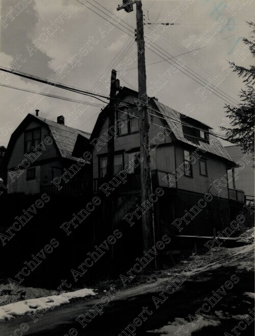 Scope & Content: Item consists of a view of houses on 1st Street and 3rd Avenue West. Handwritten annotation on recto reads: "Houses on 1st. St. & 3rd. Ave. From Alley. 1952." Stamped annotation on verso reads: "Photo by Jack Wrathall Prince Rupert, B. C."