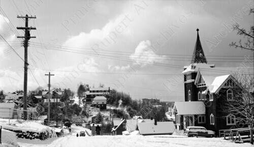 Title: 100 and 200 Blocks of 4th Avenue East Including the Presbyterian Church in Prince Rupert, B.C. in 1950