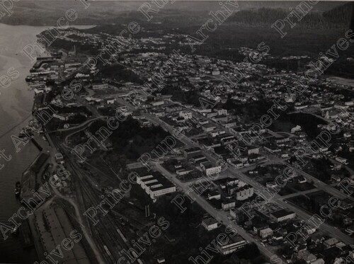 Scope & Content: Item consists of an aerial view of Prince Rupert. The view includes the Elizabeth Apartments on 1st Avenue West and 7th Street, the Prince Rupert Drydock and Shipyard and the Prince Rupert Courthouse on Market Place. Handwritten annotation on recto reads: "Prince Rupert. 1958." Stamped annotation on verso reads: "Photo by Jack Wrathall Prince Rupert, B. C."
