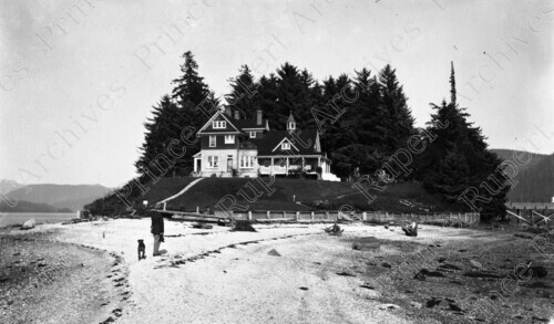 Scope & Content: Item consists of the quarantine hospital on Dodge Island (Hospital Island) across from Digby Island. A man and dog can be seen on the island's beach. The bridge to the island can be seen on the right.